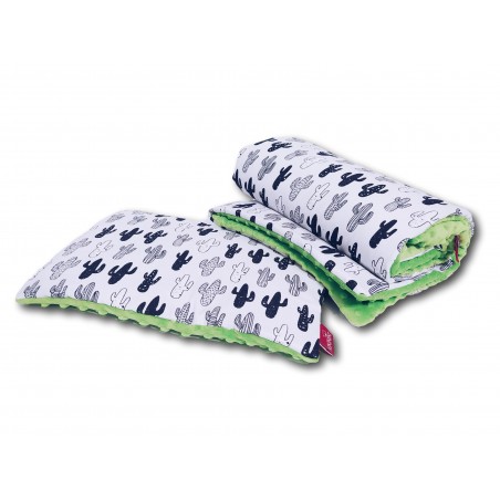 Komplet składa się z płaskiej poduszki o wymiarach 30x40 (+/-3 cm) oraz kocyka o wymiarach 75x100 (+/-3 cm)