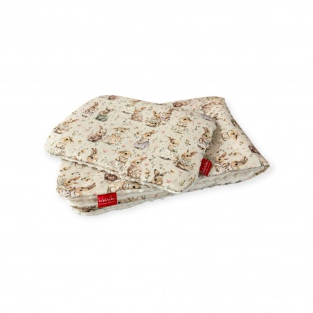 Komplet składa się z płaskiej poduszki o wymiarach 40x50 (+/-3 cm) oraz kocyka o wymiarach 75x100 (+/-3 cm)