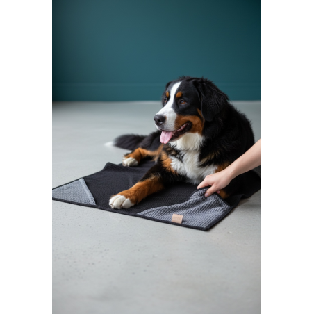 Model został zaprojektowany z myślą o maksymalnej wygodzie użytkowania – w rogach znajdują się specjalne kieszenie na dłonie, które ułatwiają pewne trzymanie ręcznika i szybkie osuszenie zwierzęcia. Dzięki temu wycieranie psa jest bardziej efektywne i komfortowe. Dodatkowo ręcznik posiada pętelkę na której można go zawiesić.