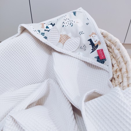Ręcznik z kapturkiem wykonany jest z bawełny typu wafel. Oryginalność produktowi nadają urocze uszka. Świetnie sprawdzi się w domu podczas kąpieli jak również na plaży czy basenie. Ze względu na swoje właściwości nadaje się dla alergików. Ręcznik posiada wszyty sznurek dzięki któremu można go bez problemu zawiesić.