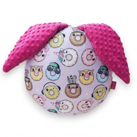 Dwustronna, ręcznie robiona poduszka wykonana z wysokogatunkowej przyjemnej w dotyku bawełny oraz niesamowicie mięciutkiego polaru minky. Oryginalności nadają jej urocze uszka. Nadruk na tkaninie jest bardzo trwały przez co nie spiera się oraz nie traci swoich właściwości po wielokrotnym praniu. Bawełna nie barwi za sprawą czego połączenie dwóch kontrastujących ze sobą kolorów nie stanowi najmniejszego problemu. Możliwość prania całej poduszki sprawia, że w łatwy i szybki sposób można zadbać o jej czystość.